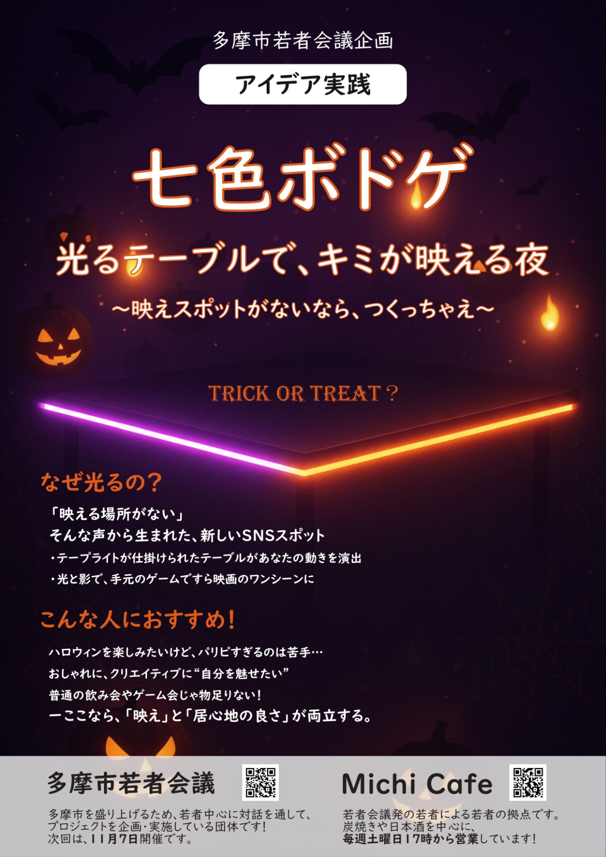 HOME > NEWS > NEWS 2025年10月25日(土)「七色ボドゲ」の開催! 2025年10月24日 イベント概要 多摩市若者会議の中でアイデアとして出た「七色ボドゲ」を多摩センターで開催決定!七色に光る映えスポットで、みんなで一緒にボードゲームを楽しみましょう! 日時10月25日(土) 10時~17時場所パルテノン大通り対象どなたでも大歓迎! Post Share Pocket Hatena LINE URLコピー -NEWS