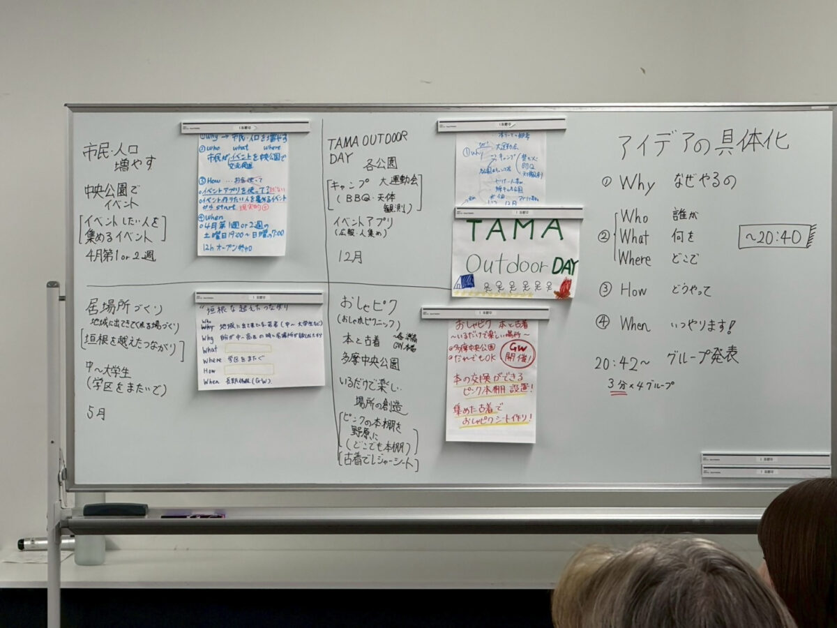 「TAMA OUTDOOR DAY」の中身は、昼間は各公園で運動会を開催し、夜は焚火やBBQを開催したいと考えている。(自然・キャンプ・運動会をキーワードに)イベントの周知については、アプリなどを通じて市民に周知していきたいと考えています。
