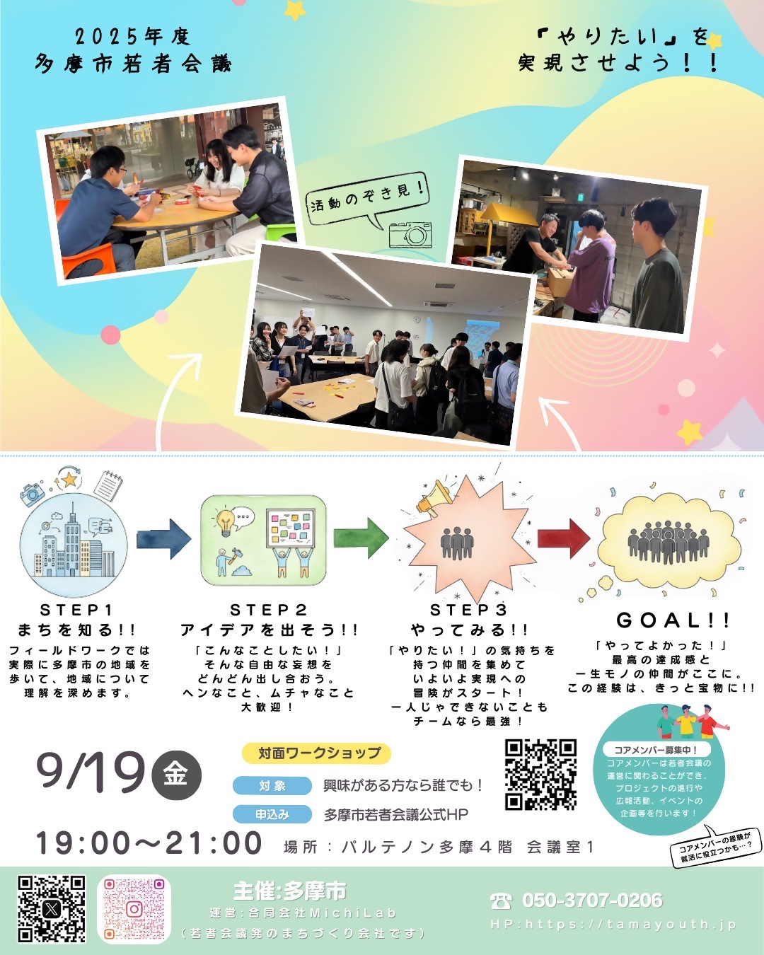 HOME > NEWS > NEWS 令和7年度第2回多摩市若者会議ワークショップ 2025年9月12日 多摩市を盛り上げるアイデア、多摩市でやってみたいことなどのアイデアを参加者間で共有しながら、アイデアの実践を目指します! 参加申し込み フライヤー 開催概要 日時2025年9月19日(金) 19:00~21:00会場パルテノン多摩4F 会議室1対象若者のまちづくりの取り組みに興味のある方ならどなたでも定員50名主催多摩市運営合同会社MichiLab 参加申し込み Post Share Pocket Hatena LINE URLコピー -NEWS